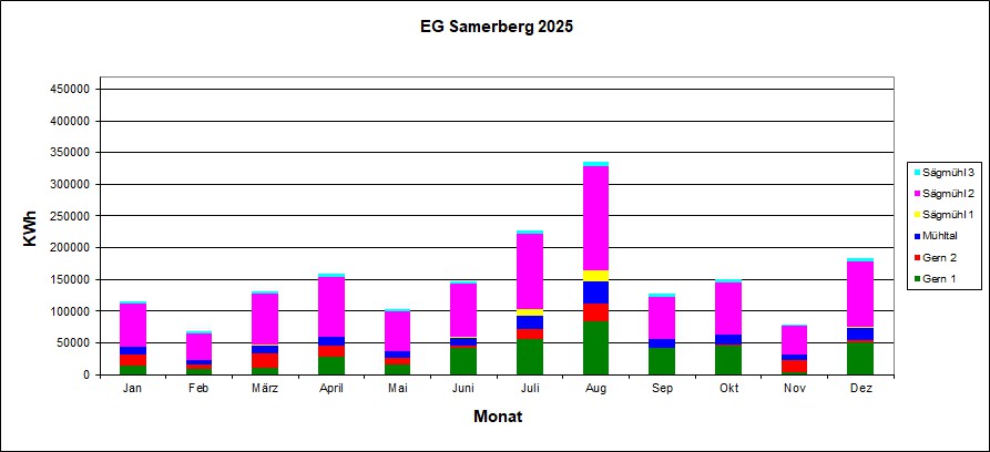 Monatsdurchschnittsleistungen von 2013 bis 2023 und die Jahresleistung 2025.